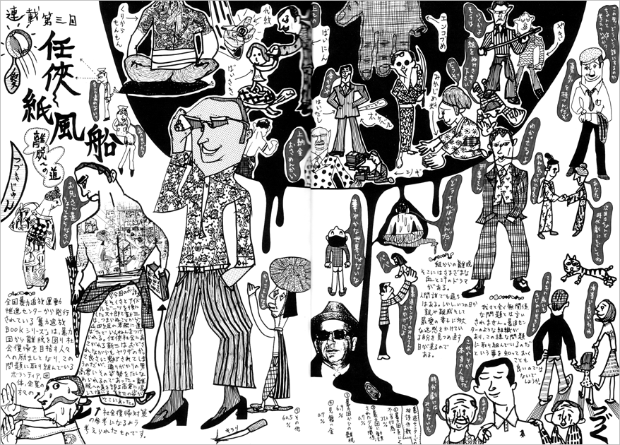 高倉というキャラクターが初登場し以降この旅に付き添うこととなります。背中の入れ墨が前回までのあらすじになっています。ほぼ中央下部に「アメリカを葬った男」とあだ名された、サミュエル・ジアンカーナというマフィアのボスもコラージュしました。そういえばタイトルが「任侠紙風船」になってますね。フレキシブルですね。