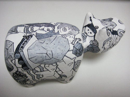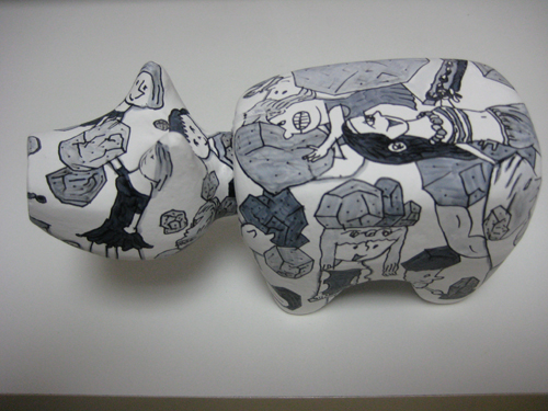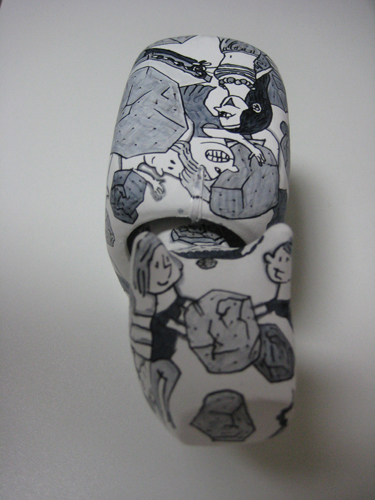 それでいろいろある中から岩石を選んで描きました。かなり前にダルマに絵を描いたことがあって、その時は腕時計と待ち合わせに遅れた女の子をごちゃごちゃ描いたところ、いろんな人から「意味が分からない」と大好評だったので、同じようにごちゃごちゃ描いてみましたが、今回は赤べことの関連があるので意味もちゃんとあります。