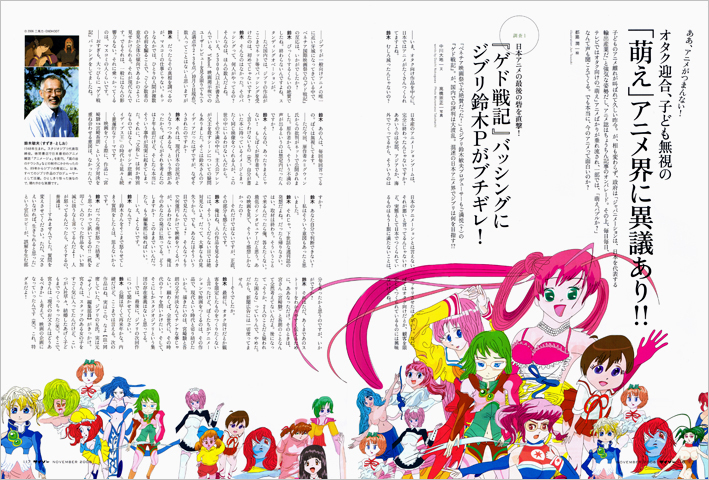 「萌え」アニメに異議あり!!と題した特集ページとびらのイラストレーションです。「ジブリ鈴木ブチギレ!」とあるように、緊迫したインタビューの内容をワンクッション入れて和らげる役割を持たせたつもりでしたが、かえって状況を煽る結果となりました。「そうムキにならず楽しくやろーよ」そんな気持ちで描いたつもりです。