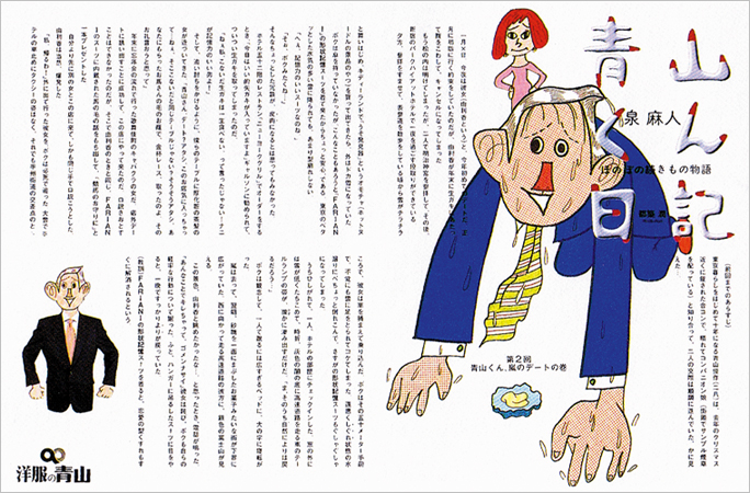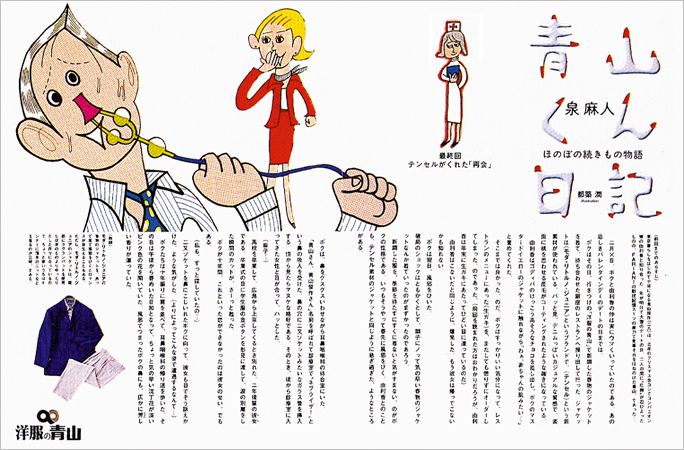 泉麻人さんの日記調の文章がとても楽しい雑誌広告です。主人公の青山くんはデートのたびになぜか不幸な目にあうのですが、結末はいつも「それでも人生は楽しい」と感じられるほのぼのしたオチになってます。全部で何回のシリーズだったか覚えてませんが、手元にあったのはこの二枚だけでした。洋服の青山はご存知のように業界最王手のスーツ専門店で、今や「ザ・スーツカンパニー」「ユニバーサル・ランゲージ」といったセレクトショップさながらのブランド展開で、若きビジネスマンの人気を呼んでいます。ほとんどスーツを着ない自分のような者にはあまり関係ありませんけど。
