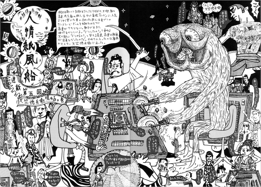 人情紙風船の第5回のテーマはチョンボです。チョンボとは麻雀プレー中にうっかりおかすミスのことで、普通チョンボした人は他のプレーヤーへの満貫払いの罰則が与えられます。その数あるチョンボのうち劣悪なものを列挙しました。話の方は旅の一行が雀荘インドで麻雀を楽しんでいるとき現れた店のマスター天竺徳兵衛が、怪物をあやつって又十郎に戦いを挑むという筋書きです。このアイデアはそのころ観た歌舞伎の「児雷也豪傑譚」から拝借したもので、今みるとこの児雷也と天竺徳兵衛がごっちゃになってますね。いずれにせよ怪物の正体は蝦蟇ということになりますが。