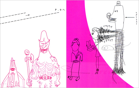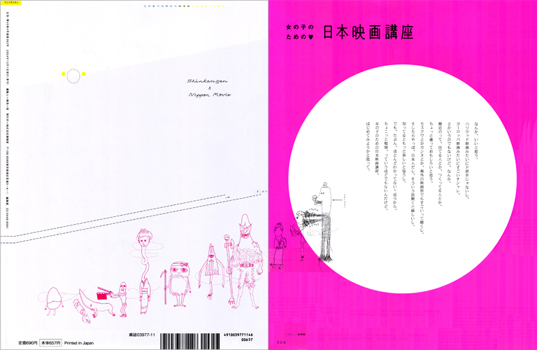 博報堂から出ている「広告」という季刊誌がありますが、その「天才!新幹線」という号で日本映画特集をやるから何か描いてくれと依頼されました。日本映画についてなら何でもいいからとにかく好きなものをということだったので、「妖怪大戦争」に出てくる妖怪たちを一列に並べて描いたところ、偶然その映画が三池崇史によってリメイクされ、特集の記事にもなっていると聞かされて驚いたのもつかの間、あがってきたデザインを見てもう一回驚きました。裏表紙から矢印が引かれ9ページの特集とびらに誘導されていたからです。つまり9ページを切取ってこんなふうに裏表紙にくっつけて並べると、一枚の絵につながるという仕掛だったのです。「ここに妖怪大戦争のことが書いてあるよ」という意味でしょうか菊地さん。パンクすぎやしませんか。