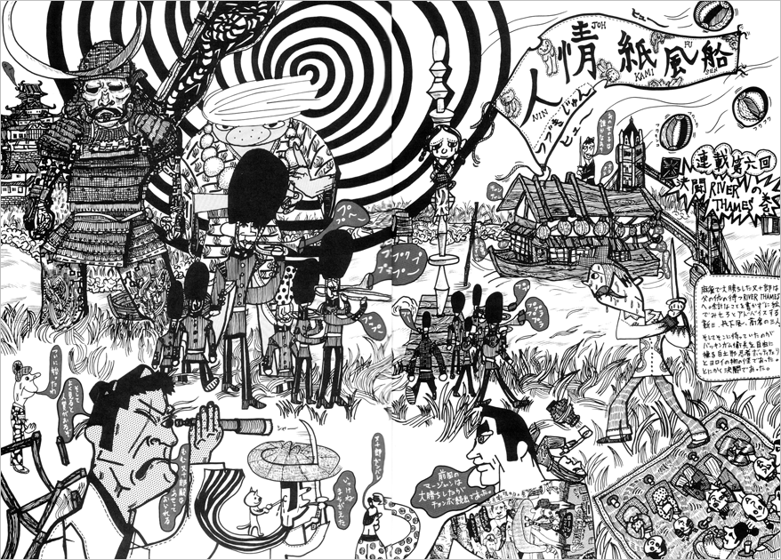 何だったかクライマックスの決闘シーンの絵だったような。麻雀を終えた旅の一行がテムズ川にさしかかった時、バッキンガム衛兵を操る白土型忍者と鎧のもののけが出てきて彼らの前に立ちはだかったんですが、桟橋に見たことのない女性が人質として捉えられているのを見て、自分らとは関係ないけどやっぱ助けるべきなのかみんなでグズグズしている風景だったと思います。右下にゴザを敷いて見物してる人たちなんかもいて、画面の緊迫感を完全に削いでますね。