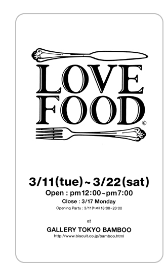 「LOVE FOOD」素晴らしいタイトルです。初めて聞いた時「トム・ジョーンズの華麗な冒険」のこのシークエンスを思い出しました(こっちのトム・ジョーンズもいいですが)展示作品にこのシーンのような艶かしさが見て取れるかはともかく、それぞれが自分勝手に描いたニュートラルな作品が、六本木のギャラリー東京バンブーに集まりました。「媒体=活動範囲」で分別ができるのもイラストレーターの面白いところですが、同業者から見ればタマらないメンバーが集ったこんな展覧会が、実はもう始まっています。