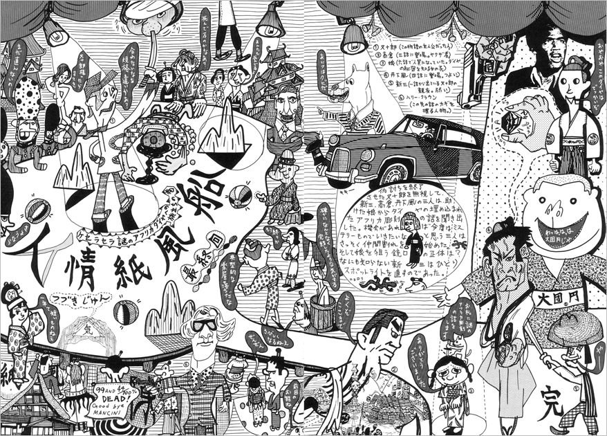 一カ所、下の方でメガネをかけてピストルから旗を出してる人についてちょっと説明しますと、これは「殺し屋ハリー/華麗なる挑戦」という映画のハリー・クラウンという主人公です。ハリー・ライムでもハリー・キャラハンでもこれでもなくハリー・クラウンです。旗に書いてある「99 AND 44/100% DEAD」はその映画の原題。何でこれを描いたのか瞬間分からなかったのですが、旗に小さく「good bye Mancini」とあるので思い出しました。この頃ヘンリー・マンシーニが他界したんですね。もちろんこの映画の音楽もマンシーニでした。特に劇中の口笛のテーマが好きだったのでレコードを随分探したところ、唯一ベスト盤の一枚に「華麗なる挑戦のテーマ」というタイトルで入ってるのを見つけました。口笛はマンシーニ自身が吹いてるそうです。映画の方もそうとう良いですよ。