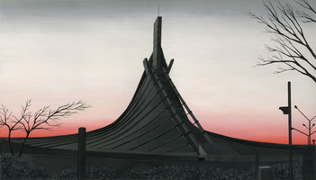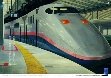 また彼はJR東日本のポスターで上越新幹線のイラストレーションも描いています。反射光をおさえた陰が良い意味で不吉な感覚を見る者に与え、とても印象的なシリーズに仕上がっていました。このような感覚はミステリーの装丁に大変良く馴染みますが、ただセンスまかせに突っ走っているわけではないと思います。展覧会のタイトル「Gradation」には、絵を通してその印象をすり込むような作者のテクニカルな主張が込められている気がしてなりません。良い意味で不吉…自分で書いていて責任をとるのが怖くなってきました。