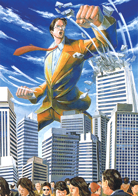 「レイオフされたやり場のない怒りを絵に昇華させるとともに、時勢を表現したという点でイラストレーションとして評価できる作品です。一見主役である巨大なビジネスマンよりもビルのコンクリートの質感に思い入れを感じるところが、会社への拭いきれない愛着を想起させ、巨人はあくまでも憤怒の具現化にすぎず、無関心な人混みの中でこちらを見ているサングラスの男こそ作者であることが容易に推測できます。」