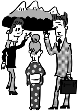 母親と再開する二人の息子の絵を何となく描いてみた。仕事だから何となくという言い方は語弊があるけど、線の緩さというか気ままさがほんわかした雰囲気をつくり出すという意味で、何となくという印象がふさわしい。かといって画面のすべてを無意識に描き抜いたわけじゃなくて、ちょっと迷った上で配置したのが着物姿の女性だった。本来このシチュエーションだと女性は手を挙げてる男性二人の手前にいなければならないが、足下の接地点をみると、右のビジネスマンらしき男の真横にいることになっちゃうので、空間的にはどうしても違和感が出る。この違和感が不安を誘うから面白い。しかし男二人がひとりの女性と出会ったという、事態そのものに変わりはない。