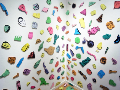 榊原美土里さんは多摩美のグラフィックデザイン科を卒業してまだそんなに経ってないそうです。どういうイキサツで「1_WALL」に応募したのかは分かりません。おじいさんや動物、食べ物を厚紙に描いて関節で切断、バラバラにしたものをハトメでつないで合体させ、ぶら下げたりダンスさせたり、多くのものはお土産用にパッケージされたりします。時々バラバラのパーツのまま壁に貼ってあるかと思えば、合体させる部品を間違えてチグハグに連結されているものもあり、創作姿勢はフレキシブルというか奔放というか、気ままにつくられた空間がとても清々しく感じられます。しかし作者本人が清々しいとは限りません。