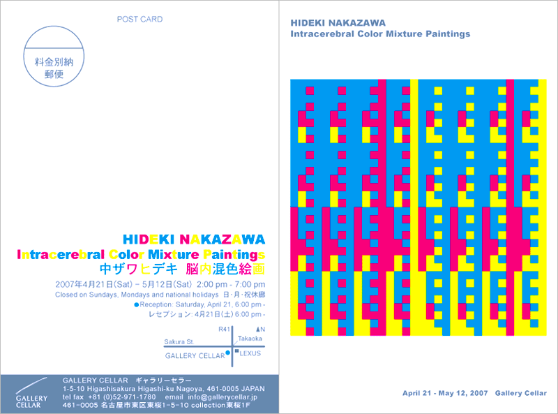 デジタル・グラフィックの分野で活躍する都築潤は、デジタルにおいてこそ「形」と「色」の二項対立が強調されるべきであると考えており、かねてからの中ザワヒデキの主張と一致しています。二人はさらに、この対立がルネッサンス芸術に於けるフィレンツェ派とヴェネツィア派の対立、アリストテレス哲学におけるエイドス(形相)とヒュレー(質料)の対立にまで遡及するとの見解においても一致しています。しかしながら都築がデジタルの形態=「ベクター」派を自任するのに対し、中ザワはデジタルの色彩=「ビットマップ」派を自任しているという立場の相違があります。都築はベクター表現者達による「ニュー・エイドス」展を企画立案中で、中ザワはビットマップ表現の最新の成果を当ギャラリーでの個展「脳内混色絵画」として現在開催中です。