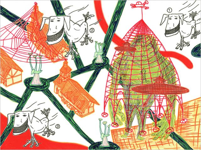 さて、左下の男の目がiモードマークになっています。これがこのイラストレーションのミソなのですが、当初はボーダフォンのマークを描いて納品したところ「それはやめてくれ」ということで差し替えられてしまいました。こうした日本メーカ−の閉鎖性に世界シェアをうばわれた原因がありそうですね。もちろん冗談ですが。TITLEホームページ