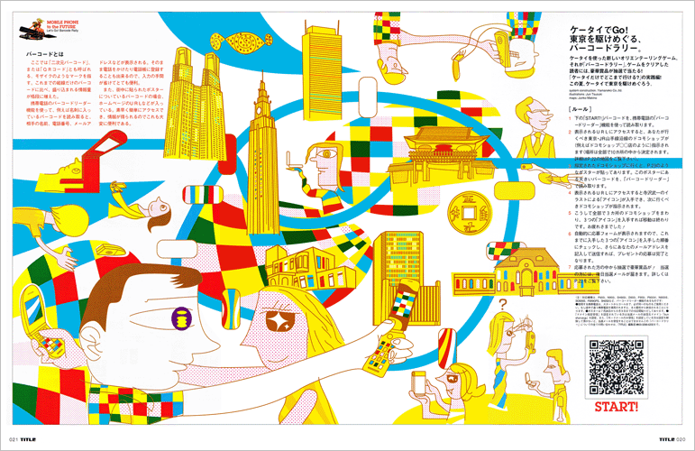 TITLEのこの号は、一冊まるまるNTTドコモとのタイアップ構成になっていて、随所にFOMAの攻略法などがちりばめられており、ドコモ愛好者にとってはとても楽しく読めます。このバーコードラリーのページも、ドコモの携帯で読み取ったQRコードの指示にしたがい、都内3カ所のドコモショップをまわって3つのアイコンを集め、プレゼントの応募資格をゲットするというゲームが紹介されています。