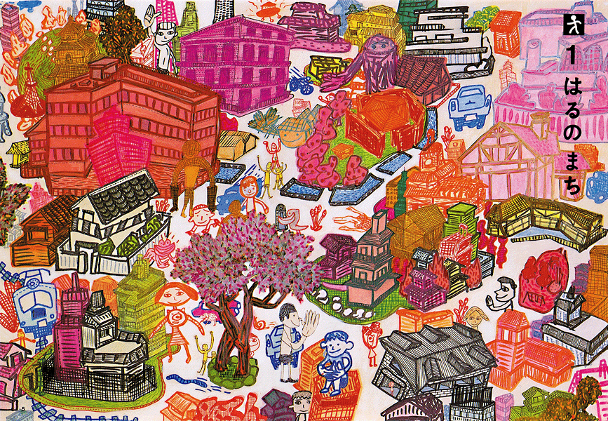 小学校1、2年生の社会と理科が統合され「せいかつ」という科目になってずいぶん経ちました。授業では、近所を探検したり、花や作物を育てたり、パーティやお祭りに参加したりするようです。この絵は平成4年度の教科書のために描いた街のパノラマですが、2年生のみんなに油断してると何が起こるかわからない街のようすを感じてもらおうと、バリバリに描き込んだのを覚えています。この教科書づくりに手腕を振るったのがADの東泉一郎さんで、表紙のデザインはアーカイブcoverに収録しました。こちらの方は、河村要助さん、谷口広樹さん、伊藤桂司さんと一緒に描いた、4人によるコラボレーションです。