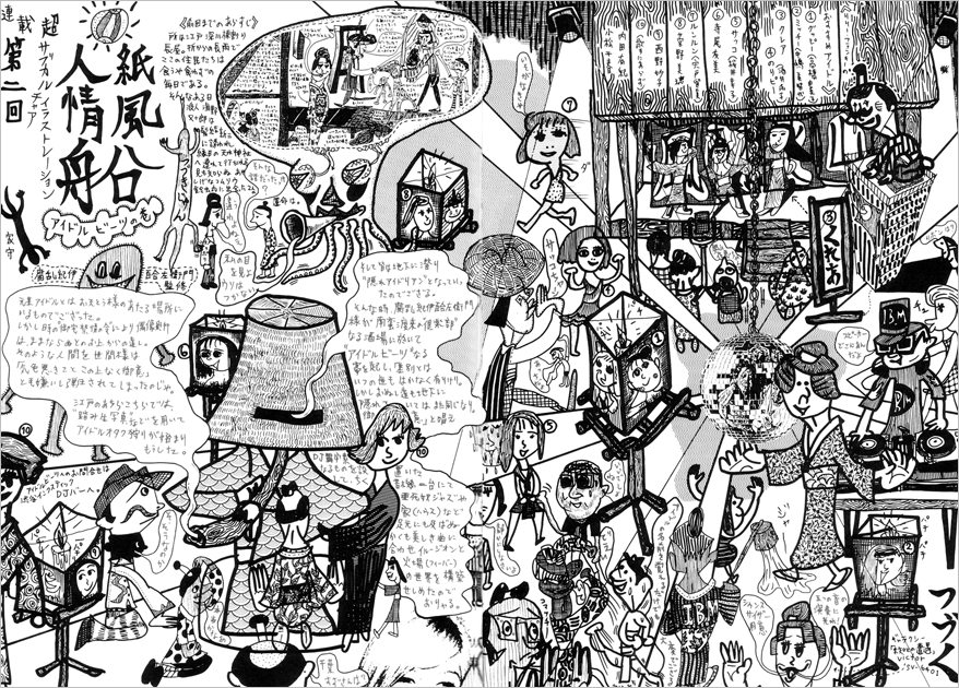 人情紙風船第2回からは副題が付き、さらにタコみたいなのの頭部に前回までのあらすじがコピぺされててとても親切です。内容はというと、当時L・フランキーが企画していたアイドルビーツなるイベントの潜入ルポでして「気色悪きことこの上なく御意」「隠れアイドリアン」などの難解なフレーズを駆使した虚無僧が、絶滅の危機に瀕していたアイドルたちのレーゾンデートルを問うといったもの。なるべく文章が読めるよう解像度も上げました。そしてアイドルといえばやはりシルビー・ヴァルタン。中央下部に若き日のシルビーをコラージュ。なおかつ何百時間も踊り続ける象徴として、映画「ひとりぼっちの青春」サントラのジャケットからミラーボールをフィーチャーといった大変きめ細やかな構成です。