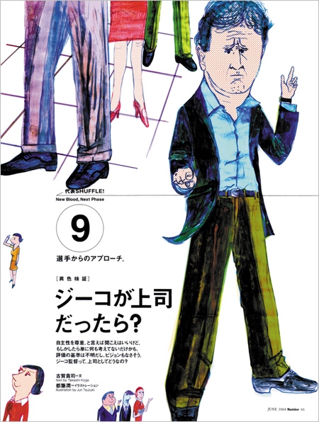 ジーコで本当に大丈夫なのか?というテーマで、当時のサッカー日本代表を検証した記事のタイトルまわりです。文中では監督のジーコを会社の上司に見立て、財部誠一などの経済系の識者の方々がさまざまな分析をしていました。ここで数ページに渡り笑ったり怒ったりするジーコ描いたのですが、描いているうちに、つまらなそうな表情を変えるとジーコではなくなってしまうことが判明し、少し不安になったのを覚えています。鉛筆と水彩絵具で描きました。Numberホームページ