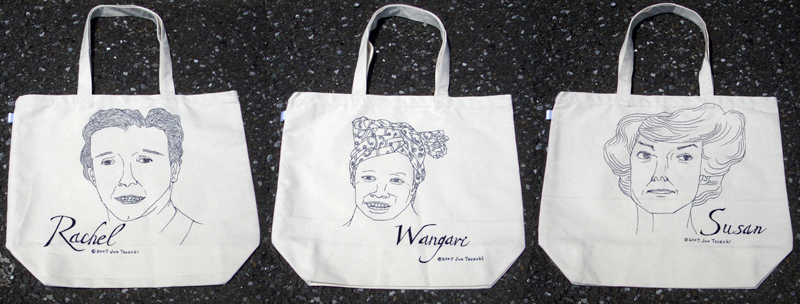 4月29日より横浜の日本新聞博物館で「MOTTAINAI(もったいない)へ~キャンペーン報道の力」を開催しています。その一環としての企画展「マイバッグチャリティ展」に女性の顔を描いたバッグを出品しました。これらはオークション形式にて販売され、売り上げはノーベル平和賞受賞ケニアのワンガリ・マータイさんの植林活動「グリーンベルト運動」に寄付されます。似顔は左から「沈黙の春」のレイチェル・カーソン、ワンガリ・マータイ、「なぜ世界の半分が飢えるのか」のスーザン・ジョージの3女史です。近くにお出での際は気軽にお立ち寄りください。博物館2Fの無料展示ゾーンです。「MOTTAINAI」詳細