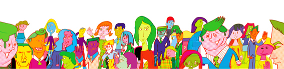 このイラストは元々は雑誌のエディトリアル用で、朝の出勤時のラッシュアワーを題材にしたものです。これ実は三部作で、そのうちの一枚だけ掲載されたんですが、本当は三枚並べることでよりもっと楽しく見れるよう描いてます。イラストレーションの年鑑には三枚合わせて載せました。全員が後ろを向いている構成があって、自分としてはそれが一番好きです。